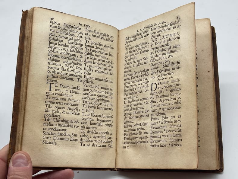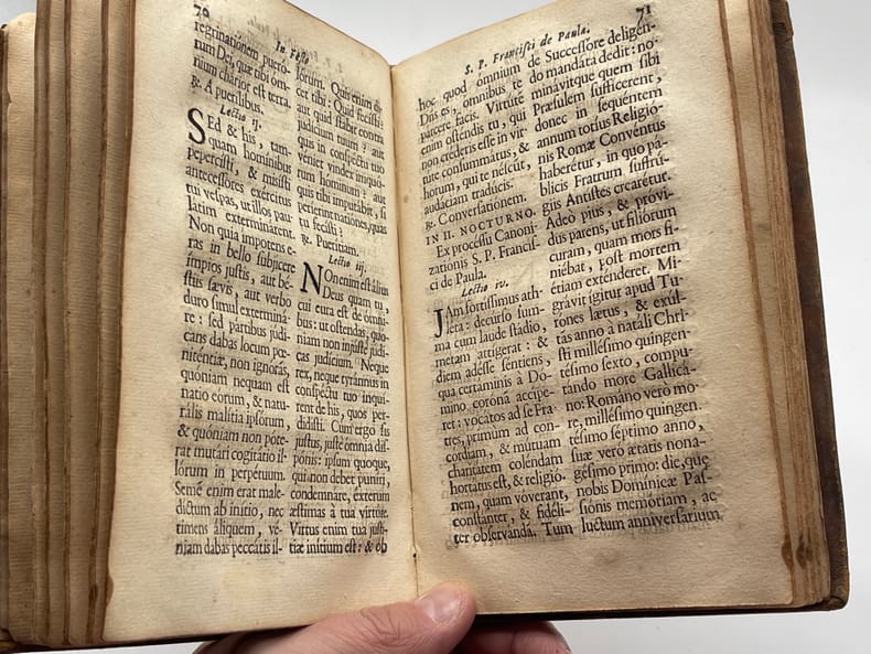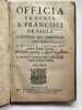 [Ordre des Minimes, Marseille], Officia propria S. Francisci de Paula, fundatoris ord. Minimorum nec non S. Michaelis Archangeli ejusdem Ordinis Patroni. S. Franc. Salesii Episc. et conf. Tertarij ejusdem Ordinis. Cum octavis. Massiliae [Marseille], Pierre Mesnier, 1708. In-8, [10]-[11-143]-[1]p. Nouvelle édition des textes propres à la fête de Saint François de Paul (1416-1507), fondateur de l'ordre des Minimes qui fut très important. La canonisation par Léon X en 1519 donna à l'ordre une fête propre à celui-ci au jour de son décès, le 2 avril. Notre édition, en plus du propre, contient différentes fêtes dont l'octave (9 avril). Cette édition est rare. Aucun exemplaire au WorldCat, un seul au Ccfr (BM Amiens). En revanche, il existe de nombreuses éditions, celle-ci semblant être la seule marseillaise. Toutes ces éditions sont relativement rares, ce qui n'est pas étonnant puisque elles étaient essentiellement réservées aux couvents. L'église Saint Michel de Marseille leur étant offerte en 1575, les Minimes s'y installèrent et le couvent fut construit à partir de 1590. Il sera détruit à la révolution. Provenance : séminaire de Nîmes, avec une étiquette XIXe sur le contreplat : « ex libris Bibliothecae Seminarii Nemausensis », probablement peu de temps après la fondation en 1822. Un autre ex-libris manuscrit sur le titre, biffé. Pleine basane, dos à nerf orné. Deux coins usés, papier un peu jauni, traces d'étiquettes de bibliothèque aux extrémités du dos. Un produit semble avoir été passé sur la reliure rendant l'aspect du cuir curieux. Edition rare.
