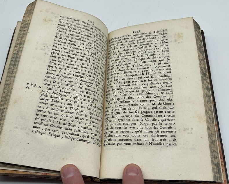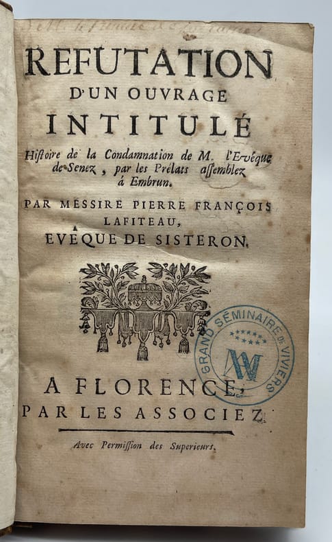 Pierre-François Lafitau, Réfutation d'un ouvrage intitulé Histoire de la Condamnation de M. l'Evêque de Senez, par les Prélats assemblez à Embrun. Par Messire Pierre François Lafiteau [sic], Evêque de Sisteron. Florence, par les Associez, sd [1729?]. In-8, 194p. Edition originale de cet ouvrage réfutant le livre Histoire de la condamnation de M. l'évêque de Senez, par les Prelats assemblez à Ambrun (s.l., s.n., 1728), de Jean-Baptiste Cadry (1680-1756), prêtre janséniste originaire d'Aix-en-Provence. L'évêque de Senez, Jean Soanen (1647-1740), janséniste, avait pris la tête du mouvement de l'Appel, c'est-à-dire des jansénistes appelant à un concile sur (contre) la bulle Unigenitus. Soanen, seul des quatre évêques de ce mouvement à ne pas être noble, fut celui choisi pour être condamné. L'ouvrage s'attache à réfuter, point par point, l'ouvrage de Cadry, donnant en glose les pages auxquelles se référer et à défendre le concile d'Embrun qui condamna Soanen et auquel il avait participé. Lafitau donne aussi des citations de divers documents, certains de 1729. L'ouvrage fut probablement publié en 1729, dans la foulée du livre de Cadry, même si Albanès et Chevalier indiquent, dans Gallia Christiana novissima (Montbéliard, 1899. I, 777), 1739, probablement une coquille reprise toutefois par certaines références. L'ouvrage, conservé dans une dizaine d'institutions françaises, est en revanche rare sur le marché. Provenances : Lucien de Contagnet (1797-1881), chanoine à Viviers, avec son étiquette sur le contreplat. Ce bibliophile possédait plusieurs milliers de livres dont certains furent donnés au grand séminaire de Viviers ; Grand séminaire de Viviers, avec le cachet à l'encre bleue sur le titre. Plein veau marbré, dos lisse orné, pièce de titre maroquin, triple filet encadrant les plats, tranches marbrées. Usures aux coins, première garde marbrée en partie détachée. Peu commun.