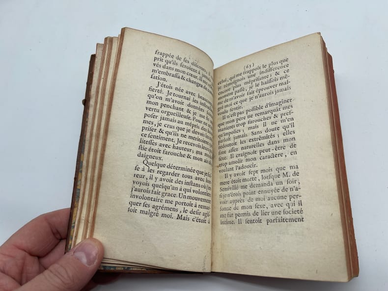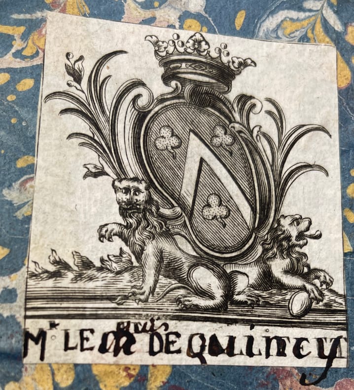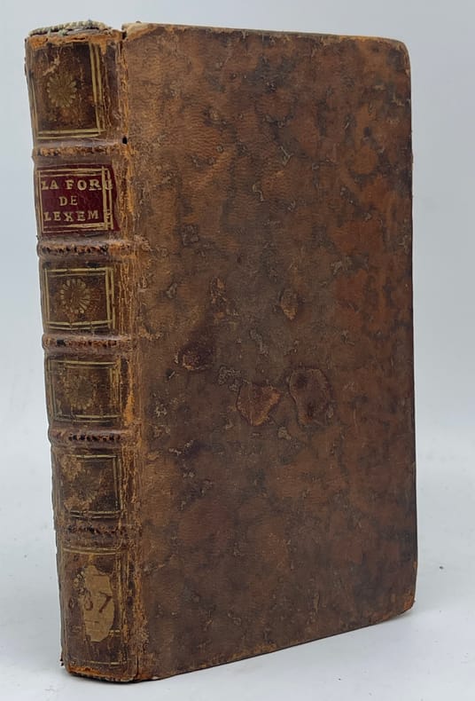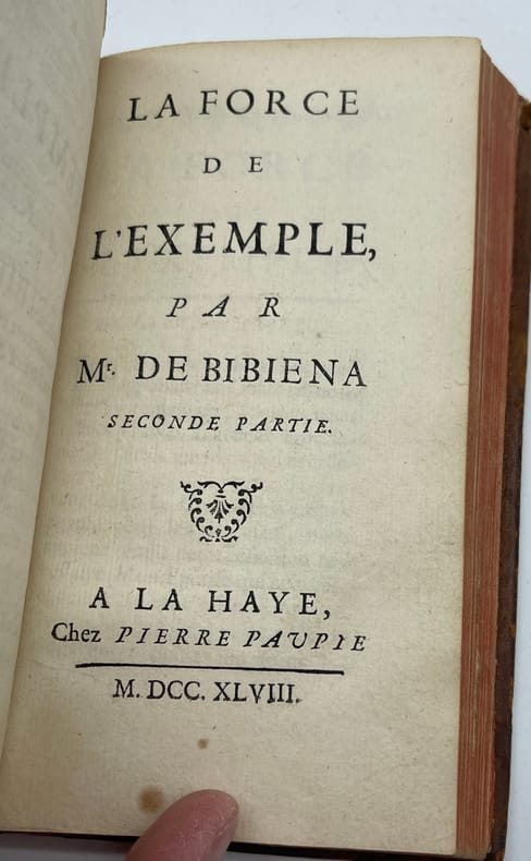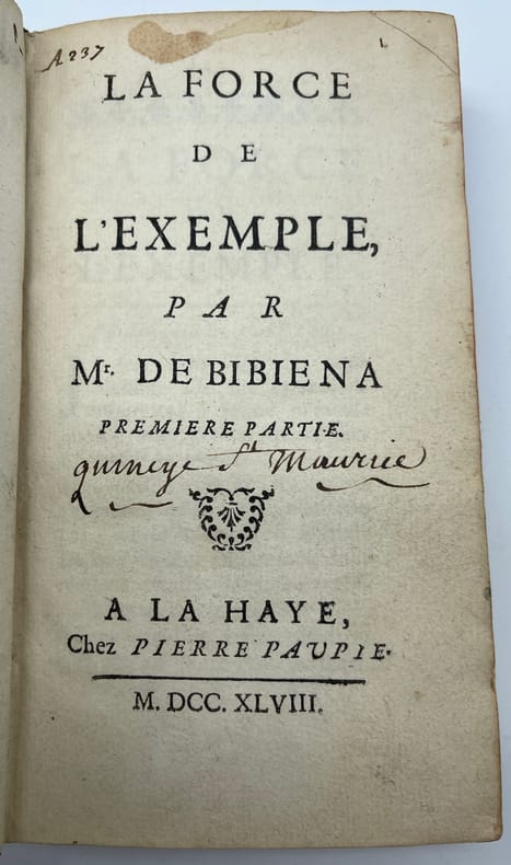 Jean Galli de Bibiena, La Force de l'Exemple. La Haye, Pierre Paupie, 1748. 2 tomes in-12 en 1 volume, [2]-217-[2]-185p. Edition originale de ce roman de l'auteur libertin. La Correspondance littéraire, philosophique et critique en donne une critique assez mauvaise : « Le sujet en est simple : c'est une femme qui a toutes les raisons du monde de se plaindre de son mari, et qui, malgré ses penchants demeure attachée à son devoir par l'exemple d'une cousine aussi malheureuse, mais plus vertueuse. Le style de cet ouvrage manque également de naïveté, d'élégance et de correction. Les moeurs en sont bonnes, les caractères soutenus, mais sans dignité ; les situations en sont brusquées, souvent amenées, tantôt usées et quelquefois neuves, hardies et intéressantes. Il arrive rarement que l'auteur embellisse ce qu'il prend ; il lui estp lus ordinaire de le gâter. Par exemple, un amant, n'osant faire sa déclaration, apprendre à un perroquet, dans ce roman, le mot d'amour, et cela est dit le plus maussadement du monde ». Provenance : Philippe Christophe Amateur de Galliffet (1711-1759), avec son ex-libris gravé sur le contreplat (base AFCEL n°G0220) surchargé « M Le Muis de Quincy » ; Le marquis de Quincy-Saint-Maurice, avec la surcharge sur l'ex-libris gravé et la mention « Quincy St Maurice » sur le titre. Toutefois, il ne peut pas s'agit de Charles Sevin de Quincy (1660-1738) dont l'épouse était Geneviève Pecquot de Saint-Maurice. Etant donné qu'ils n'eurent qu'une fille, cet ex-libris nous semble farfelu. Pleine basane, dos à nerfs, fleurons dans les caissons, pièce de titre, trranches rouges. Coiffes arasées, manques en bout de nerfs et aux coins, papier légèrement jauni, dernière garde marbrée manquante. Ouvrage introuvable.