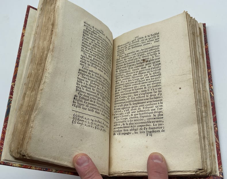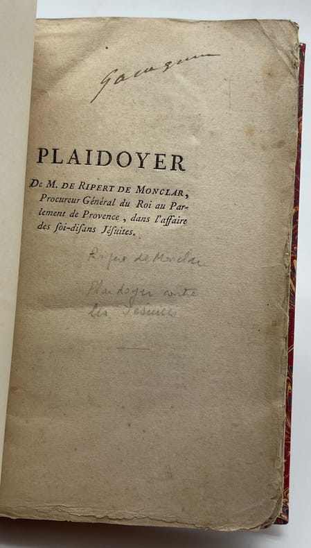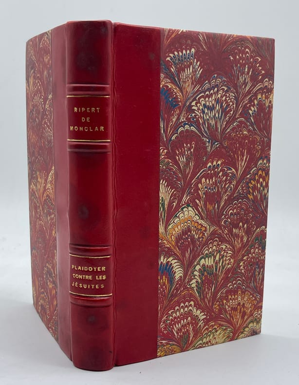 Jean-Pierre-François Ripert de Monclar, Plaidoyer de M. de Ripert de Monclar, Procureur Général du Roi au Parlement de Provence, dans l'affaire des soi-disans Jésuites. S.n., s.l., s.d. [1763]. In-12, 271p. Une des deux éditions publiées vraisemblablement en 1763 faisant suite à l'« audience publique tenue par le Parlement de Provence » le 4 janvier 1763. Le plaidoyer de Ripert de Monclar est donc un long réquisitoire contre les Jésuites. Il se termine p.251 et est suivi de « réflexions sur les pièces servant à l'intelligence du décret d'Aquaviva », i.e. le décret de Claudio Acquaviva (1543-1615), jésuite italien, contre le régicide. Les Jésuites furent expulsés de France en 1764. Reliure moderne, demi-basane rouge, dos à nerfs, rogné en tête uniquement. Petites taches sur le dos. Petite mouillure claire en fond de quelques feuillets. Bon exemplaire.