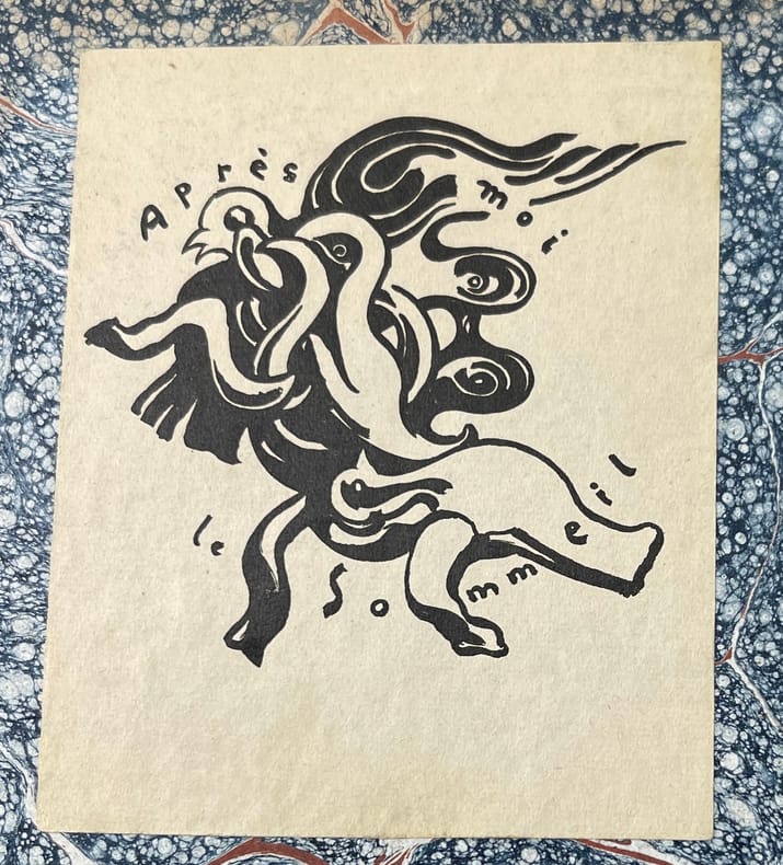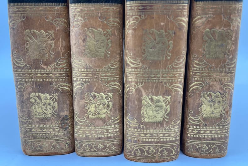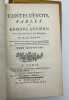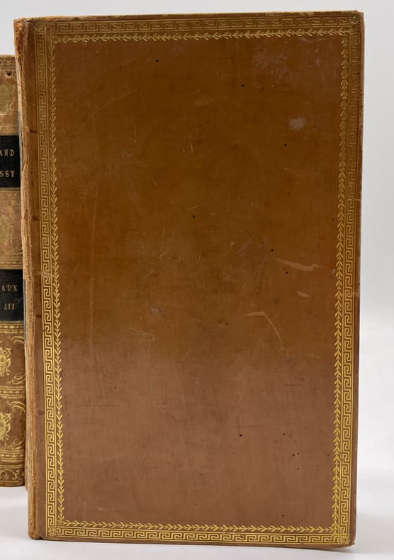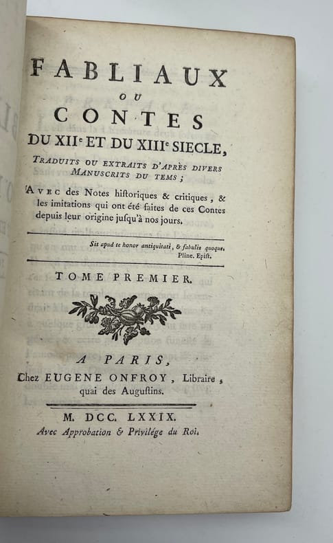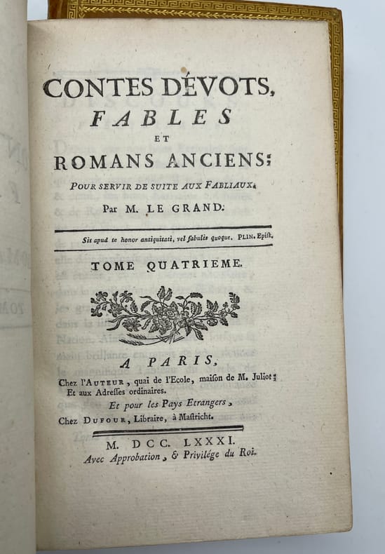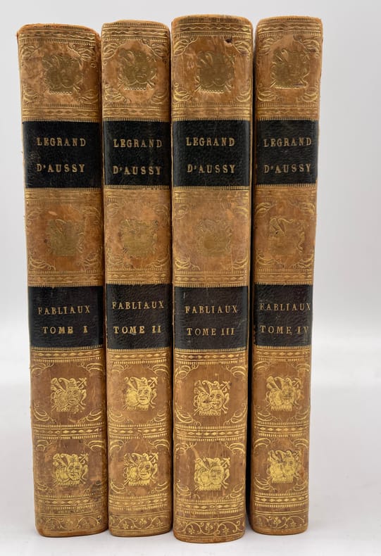Pierre Jean-Baptiste Legrand d'Aussy, Fabliaux ou contes du XIIe et du XIIIe siècle traduits ou extraits d'après divers manuscrits du temps ; Avec des notes historiques & critiques, & les imitations qui ont été faites de ces Contes depuis leur origine jusqu'à nos jours [&] Observations sur les troubadours, par l'éditeur des Fabliaux [&] Contes dévots, fables et romans anciens ; pour servir de suite aux Fabliaux, par M. Le Grand. Paris, Eugène Onfroy, 1779 & Paris, chez l'auteur, 1781. 4 volumes in-8, [4]-CIX-[5]-414-[2]p [y compris la figure face à la p.1], [4]-430-[1]p, [4]-[2]-68-468p & [4]-XLVI-[2]-400p. Edition originale complète de cet important ensemble de contes, bien complet du supplément sur les troubadours, relié ici en tête du tome 3 avec faux-titre ([2]-68p). « Exceptionnel exemplaire en grand papier » (Piasa) vergé et grand de marges (203*127mm) avec certains feuillets encore aux témoins. « Ce recueil contient un grand nombre de morceaux piquants par la naïveté et par le ton satirique, double caractère qui distingue éminemment les ouvrages des plus anciens de nos poètes ; aucun livre ne fait mieux connaître les moeurs d'une époque qui ne mérite pas tous les regrets qu'on est tenté de lui accorder. » (PP Augustin & Alois de Backer, Bibliothèque des écrivains de la compagnie de Jésus. Liège, Grandmont-Donders, 1859. Cinquième série. p.251). Provenance : Paul Eluard (1895-1952), poète, avec son bel ex-libris gravé par Max Ernst (1891-1976) portant la devise « après moi le Sommeil » ; Paris, vente Piasa, 24 novembre 2005, n°186. Jolie reliure parlante : le fer dans les caissons porte un masque, un bouclier et des trompes. Reliure signée Bozerian, légèrement postérieure (ca.1800), plein veau blond glacé, dos lisse orné, pièces de titre et tomaison maroquin noir, dos orné, roulette encadrant les plats, roulette sur les coupes et en bordure des contreplats, tranches dorées. Mors et coiffes parfois un peu frottées, quelques coins un peu usés. Très bel exemplaire à la belle provenance.