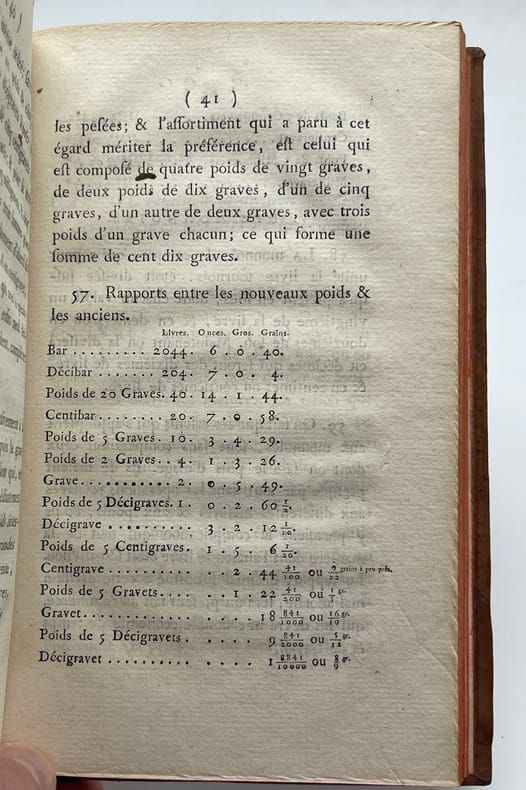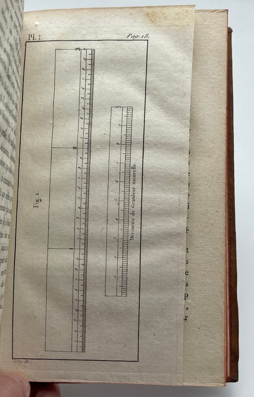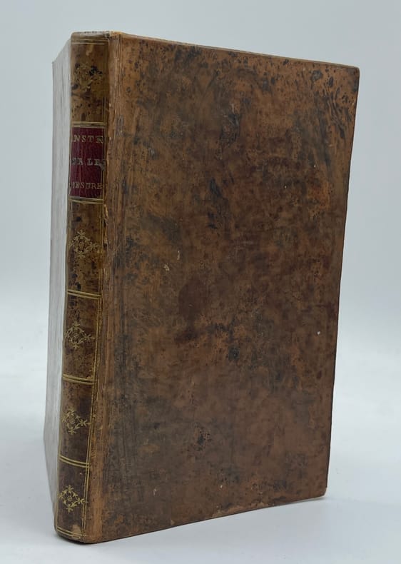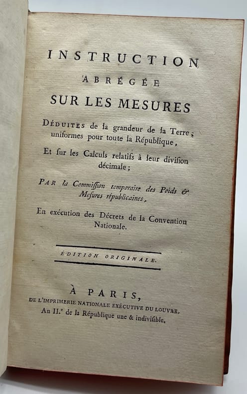 [sous la direction de René-Just Haüy] Commission temporaire des Poids & Mesures républicaines, Instruction abrégée sur les mesures déduites de la grandeur de la Terre, uniformes pour toute la République et sur les Calculs relatifs à leur division décimale par la Commission temporaire des Poids & Mesures républicaines En exécution des Décrets de la Convention Nationale. Paris, Imprimerie nationale exécutive du Louvre, an II [1794]. In-8, XIV-147-[28]p & 3 planches. Edition originale de cet important ouvrage, rouage essentiel dans la définition des nouvelles mesures et qui fut réimprimé un peu partout en France. Elle explique la méthode adoptée et donne des tableaux de conversion pour les mesures linéaires, surfaces, solides et mesures de capacité. On notera en particulier la première planche qui est probablement l'une des toutes premières représentation du centimètre, présentant un « Décimètre de grandeur naturelle ». Ces mesures furent notamment définies par Lavoisier et René-Just Haüy (1743-1822), un prêtre réfractaire sauvé par ses sciences et nommé par la Convention dans cette commission. Plein veau marbré, dos lisse, fleurons, pièce de titre maroquin, roulette sur les coupes, tranches rouges. Trou de ver traversant les ? de l'ouvrage, dans le texte, sans atteinte à la compréhension. Papier bien conservé, légers défauts (mis à part ce travail de ver). Joli exemplaire.