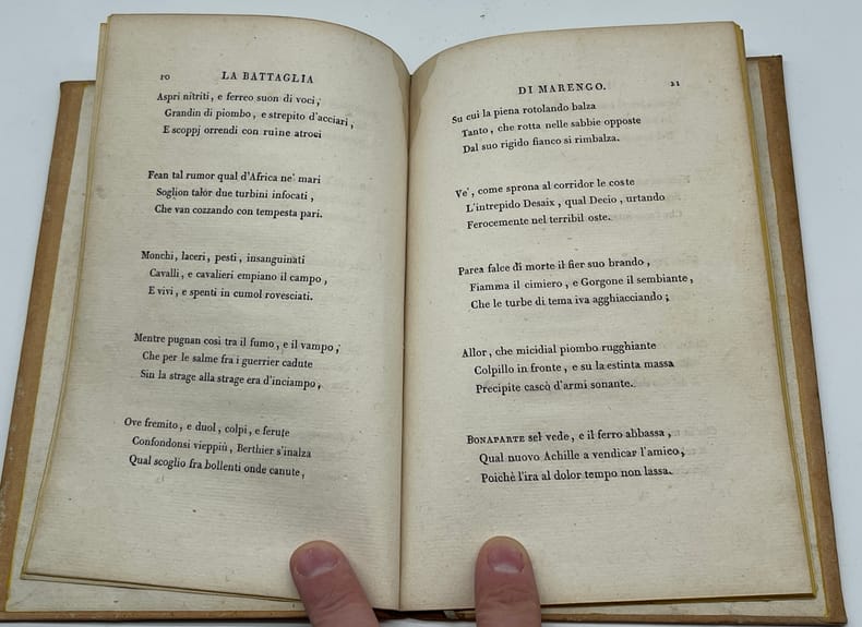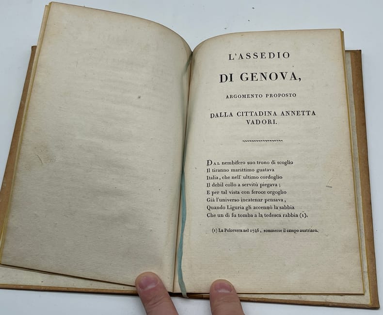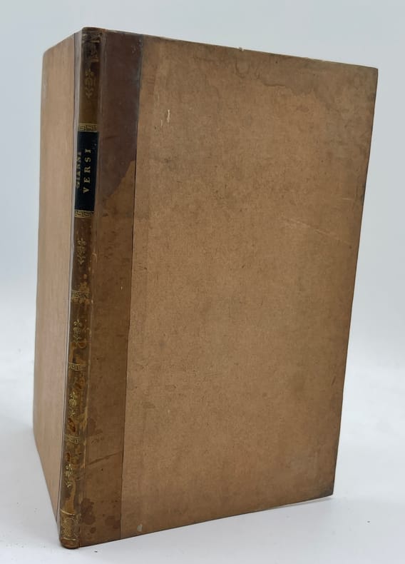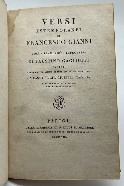Francesco Gianni ; Faustino Gagliuffi, Versi estemporanei di Francesco Gianni colla traduzione improvvisa di Faustino Gagliuffi cantati nella conversazione letteraria de 22 fruttifero in casa del cit. Giuseppe Fravega. Parigi [Paris], P Didot il Maggiore [Pierre Didot l'aîné], an VIII [1800]. In-8, 29p [i.e. 27p]. Première édition collective, en partie originale, de ce court ouvrage dont l'origine nous est donnée par le Magasin encyclopédique. Il semble que les deux textes de Gianni ont été publié séparément en Italie mais sans la traduction latine de Gagliuffi. « Dans une réunion littéraire, qui eut lieu chez le ministre ligurien, Fravega, le 22 fructidor dernier [9 septembre 1800], l'improvisateur Gianni fut invité à donner une nouvelle preuve de son talent. On lui propose successivement, pour sujets, la bataille de Maringo et le siège de Gènes, et sa verve féconde lui inspira les deux pièces, l'une de 103, l'autre, de 144 vers, que l'ont lit ici. Mais ce qui nous parait bien plus extraordinaire, c'est que, sur trois secrétaires qui avaient été priés d'écrire les vers de Gianni, à mesure qu'il les chanterait, il s'en trouva un qui, au lieu de les recueillir dans l'original, les avait tendus en beaux vers latins ; et c'est cette traduction, presque incroyable, que l'on offre également dans cet imprimé. Gagliuffi a seulement un peu abrégé Gianni, de manière que la première pièce de 103 vers se trouve rendue en 48 ; et l'autre, de 144, en 72 : la première est en vers élégiaques, la seconde en vers héroïques. Nous nous bornerons à faire connaître à nos lecteurs cette traduction, comme une singularité littéraire » (Millin, Magasin encyclopédique. Tome IV. Paris, Fuchs, an VIII - 1800. p.138). Un seul exemplaire dans les bibliothèques publiques selon le Ccfr et le WorldCat, à la BnF. Demi-basane, dos lisse, fleurons, pièce de titre. Petite mouillure en haut du dos et en haut de premier plat, visible sur le papier en fond de cahier. Rare document.