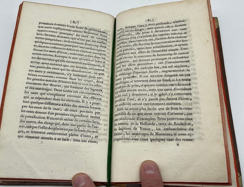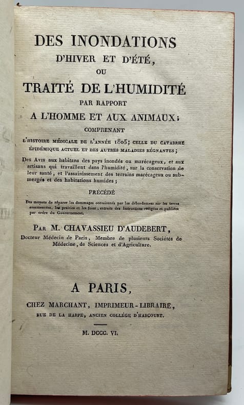 [Médecine] M. Chavassieu d'Audebert, Des inondations d'hiver et d'été, ou traité de l'humidité par rapport à l'homme et aux animaux comprenant l'histoire médicale de l'année 1805 ; celle du catarrhe épidémique actuel et des autres maladies régnantes ; des avis aux habitans des pays inondés ou marécageux et aux artisans qui travaillent dans l'humidité, sur la conservation de leur santé, et l'assainissement des terrains marécageux ou submergés et des habitations humides. Paris, Marchant, 1806. In-8, [8]-127p. Edition originale de cette étude médicale qui aura une seconde édition en 1807 (peut-être une remise en vente). Chavassieu d'Audebert, qui fut médecin à Versailles, était membre de nombreuses académies. Toutefois, si plusieurs études médicales, épidémiologiques, ont été publiées au début du XIXe, sa vie est mal documentée. Le Dictionnaire encyclopédique des sciences médicales (1874) faisait déjà cette constatation, précisant que cet « estimable savant » disparait après 1812 et donnant une liste de sept ouvrages. Cet ouvrage est rare. Seuls deux exemplaires sont conservés dans les institutions françaises (et deux à la date de 1807). Demi-basane, dos lisse, pièces de titre, tranches rouges. Petit manque à la coiffe et en tête du mors supérieur. Bon exemplaire de cet ouvrage médical rare.