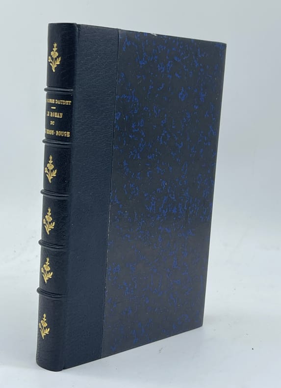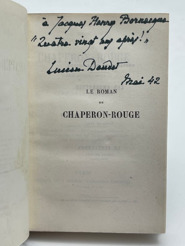 Alphonse Daudet, Le Roman du Chaperon-Rouge, scènes et fantaisies. Paris, Michel Lévy frères, 1862. In-12, [8]-197p. Edition originale d'un des premiers livres d'Alphonse Daudet, publié à 22 ans. Exemplaire enrichi d'un bel envoi de son fils Lucien Daudet (1878-1946) faisant référence à Alexandre Dumas : « À Jacques-Henry Bornecque / "Quatre vingt ans après !" / Lucien Daudet / mai 42 ». Jacques-Henry Bornecque (1910-1995) était un universitaire français, spécialiste, notamment, de Daudet. Il est aussi l'éditeur intellectuel du Comte de Monte-Cristo de Dumas chez Garnier dans les années 50, ce qui rend la référence prémonitoire. Reliure signée « ateliers Laurenchet », demi-maroquin bleu nuit à coins, dos à nerfs, fleurons, tête dorée, couvertures et dos conservés, papier particulièrement bien conservé. Couverture légèrement vieillie. Très bel exemplaire.