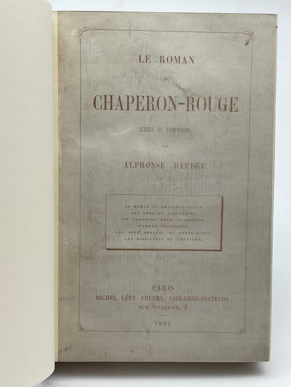 Paris, Michel Lévy, Paris, Michel Lévy1862 ; Petit in-12, broché, couverture crème imprimée en rouge. 1 f. blanc, 3 ff., 195 pp., 1 f., 1 f. blanc. EDITION ORIGINALE du troisième livre du jeune Daudet, alors âgé de 22 ans. C'est un recueil de six textes : « Les Ames du Paradis, L'Amour-Trompette, Les huit pendues de Barbe-Bleue, Un concours pour Charenton, Les rossignols du Cimetière » et celui qui donne le titre au volume. Talvart 4 A - Brivois 8-9. Couverture un peu défraîchie.