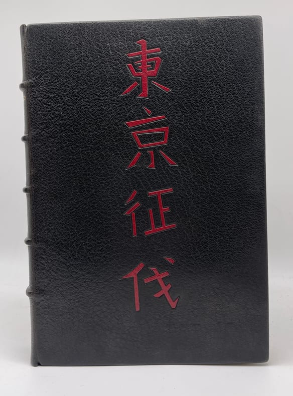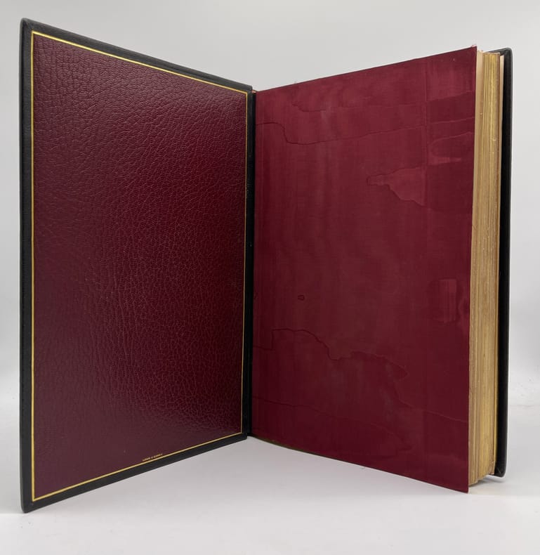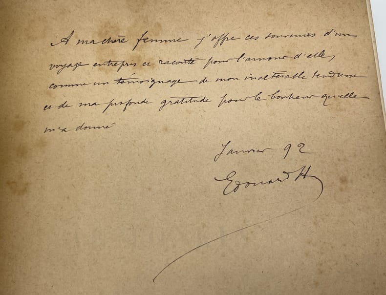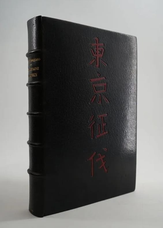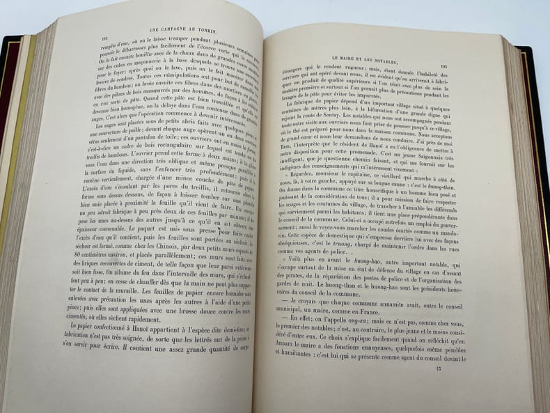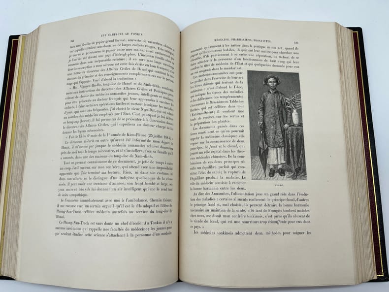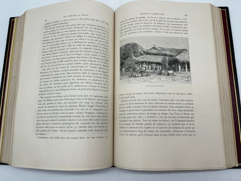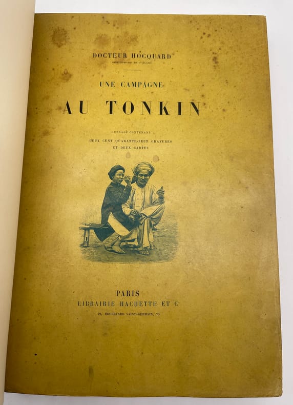 Charles-Edouard Hocquard, Une Campagne au Tonkin. Paris, Hachette, 1892. In-8, 539p. Edition originale, illustrée de 247 photogravures, certaines à pleine page, et deux cartes. Hocquard, médecin, est surtout connu pour ses photographies, notamment du Tonkin dont il fit la campagne comme volontaire en 1883. Exemplaire enrichi d'un bel envoi à sa femme : « A ma chère femme j'offre ces souvenirs d'un voyage entrepris et raconté pour l'amour d'elle, comme un témoignage de mon inaltérable tendresse et de ma profonde gratitude pour le bonheur qu'elle m'a donné. Janvier 92. Edouard H ». Les exemplaires de ce livre avec envoi semblent rares. Jolie reliure parlante portant une mosaïque sur le premier plat, traduction du titre de l'ouvrage en chinois traditionnel. Reliure signée Canape & Corriez, datée 1931, plein maroquin noir, titre mosaïqué en rouge sur le premier plat, doublures de maroquin rouge, tranches dorées sur témoins, couvertures conservés (sans le dos). Quelques rousseurs éparses. Etui bordé avec début de fente à une arête. Magnifique exemplaire.