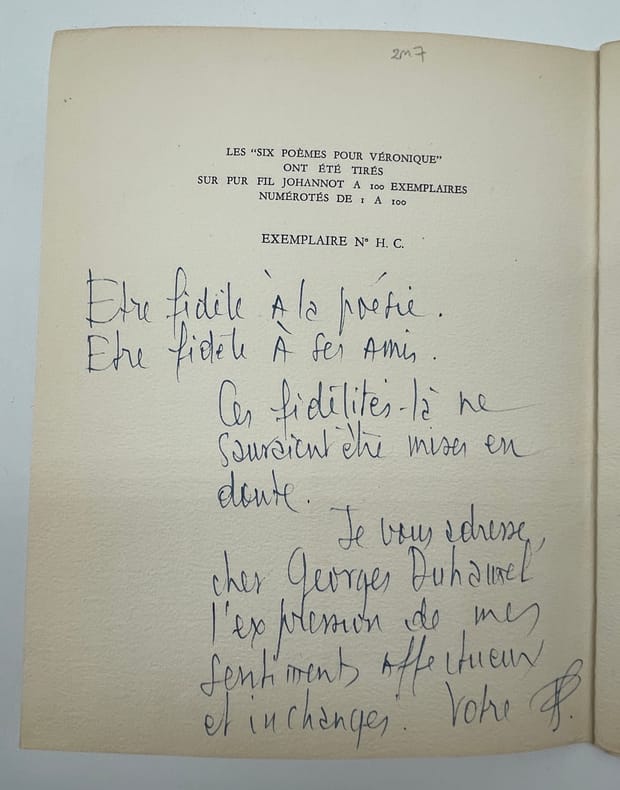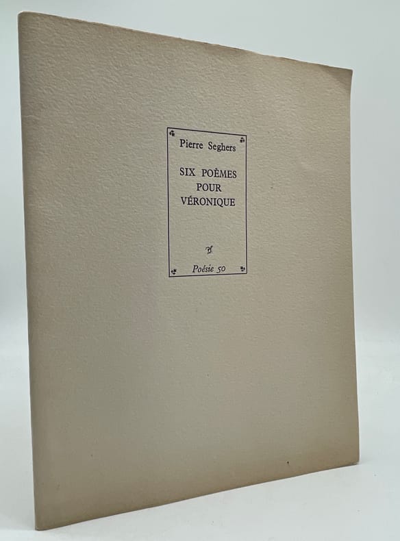 Pierre Seghers, Six Poèmes pour Véronique. Paris, Poésie 50 [imprimerie Macléval], 1950. In-4, 11p (couverture comprise dans la pagination). Plaquette tirée à 100 exemplaire sur pur fil Johannot, le nôtre un exemplaire supplémentaire hors-commerce avec un bel envoi à l'écrivain Georges Duhamel : « Etre fidèle à la poésie. Etre fidèle à ses amis. Ces fidélités-là ne sauraient être mises en doute. Je vous adresse, cher Georges Duhamel, l'expression de mes sentiments affectueux et inchangés. Votre PS ». En feuilles. Très bel état. Très bel exemplaire avec un long envoi.