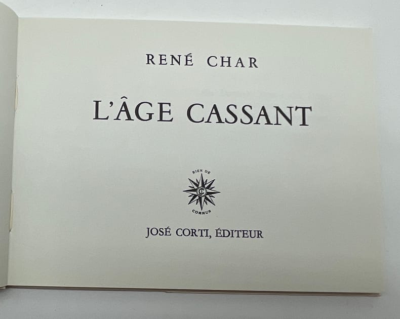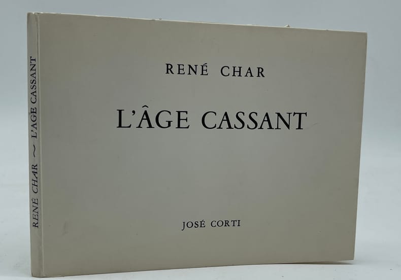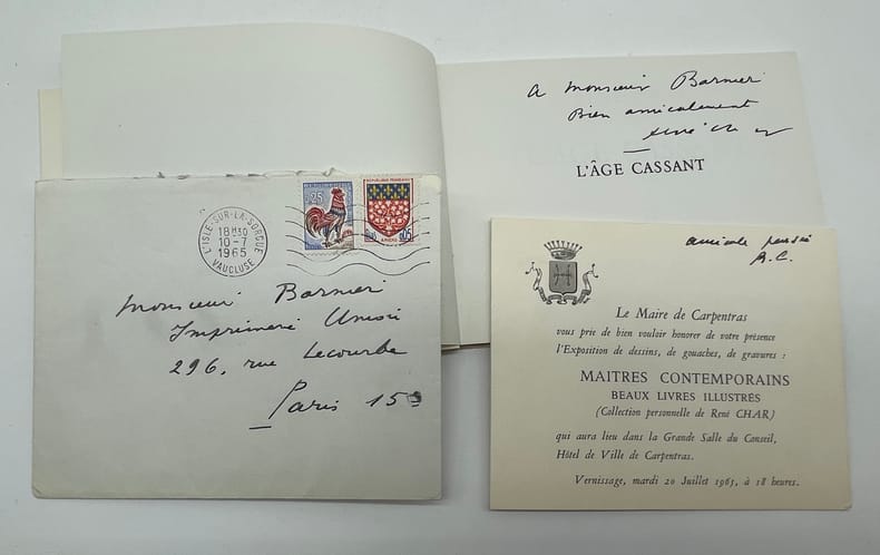 René Char, L'Âge cassant. Paris, José Corti, 1965. In-12 oblong, [8]-XLIII-[13]p. Edition originale de ce recueil, tirée à 850 exemplaires, le nôtre l'un des 600 sur vélin Robertsau. Un autre tirage sera fait en 1967. Exemplaire enrichi d'un envoi à l'imprimeur Louis Barnier (1924-2000), ami de René Char et membre du Collège de Pataphysique : « à Monsieur Barnier / bien amicalement / René Char ». Exemplaire portant deux corrections : une inversion de deux mots, p.XXXVII - certainement de la main de Char - et une petite correction à la justification (d'un autre main ?). On joint une invitation au vernissage de l'exposition de livres illustrés de la collection de René Char à Carpentras le 20 juillet 1965. Cette invitation porte la mention autographe « amicale pensée R.C. » et a conservé son enveloppe autographe adressée à Barnier. Broché, couverture rempliée, très bel exemplaire. Ouvrage étonnamment rare malgré le tirage.