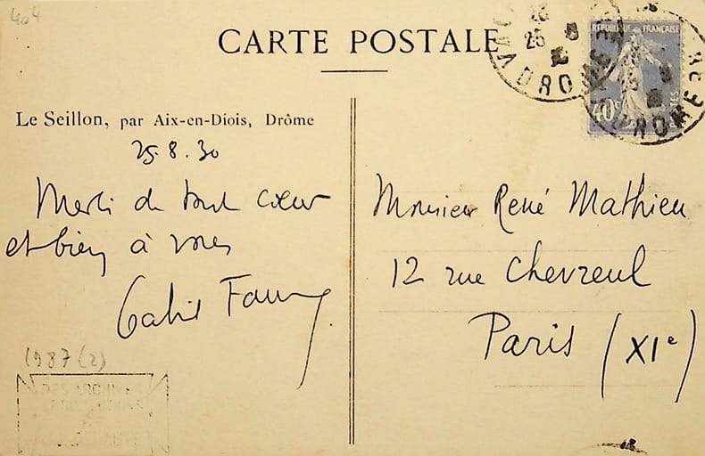 Gabriel Faure (1877-1962), poète, écrivain. L.A.S., 25 août 1930, 1p in-12. A René Mathieu, probablement René Mathieu (1900-1960), journaliste, éditeur. Petit courrier amical. Cachet de la collection Jean-Louis Debauve. [16]