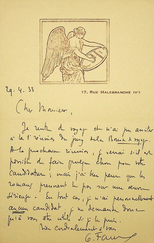 Gabriel Faure (1877-1962), poète, écrivain. L.A.S., 29 avril 1933, 1p in-8. A René Mathieu, probablement René Mathieu (1900-1960), journaliste, éditeur. Il a raté la première réunion d'un prix mais essayera de faire quelque chose à la prochaine pour la candidature de son correspondant. Il s'agit du prix « Bourse Nationale de Voyage Littéraire » dont Gabriel Faure était le secrétaire. Cachet de la collection Jean-Louis Debauve. [16]