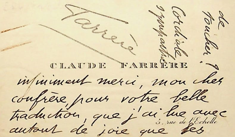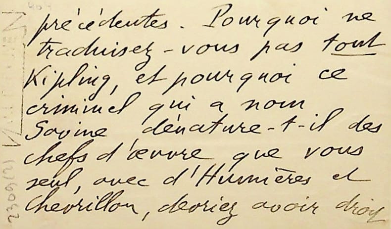 Claude Farrère (1876-1957), écrivain, officier de marine, membre de l'Académie française. C.A.S., sd [1932], R°V°. A Louis Fabulet (1862-1933), écrivain. « infiniment merci, mon cher confrère pour votre belle traduction, que j'ai lue avec autant de joie que les précédentes. Pourquoi ne traduisez-vous pas tout Kipling, et pourquoi ce criminel qui a nom Savine dénature-t-il des chefs d'oeuvre que vous seul, avec d'Humières et Chevrillon, devriez avoir droit de toucher ? Cordiale sympathie. Farrère ». Fabulet avait en effet traduit Une histoire d'Angleterre pour la jeunesse. Il traduira aussi, avec Robert d'Humières, Le Livre de la jungle. Cachet de la collection Jean-Louis Debauve. [16]
