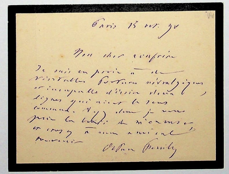 Octave Feuillet (1821-1890), écrivain, membre de l'Académie française. L.A.S., Paris, 15 octobre 1890, 1p in-12. Peut-être à Louis Schneider (1861-1934) selon la note de Debauve. Très difficile à lire : « Mon cher confrère, je suis en proie à de véritables fièvres névralgiques et incapable d'écrire deux lignes qui aient le sens commun. Ayez donc, je vous prie, la bonté de m'excuser et croyez à mon amical souvenir. Octave Feuillet ». Cachet de la collection Jean-Louis Debauve. Probablement un des derniers courriers de Feuillet. [16]