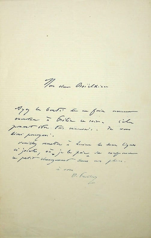 Octave Feuillet (1821-1890), écrivain, membre de l'Académie française. L.A.S., sd, 1p in-8. Au compositeur Louis Boïeldieu (1815-1883), fils de François-Adrien. « Mon cher Boïeldieu, Ayez la bonté de ne faire aucune ouverture à Prélin[?] ce soir. Cela pourrait être très mauvais. Je vous dirai pourquoi. Veuillez remettre à [mot illisible] les deux lignes ci-jointes, où je le prie de conformer ce petit changement dans nos plans. A vous. O Feuillet ». Cachet de la collection Jean-Louis Debauve. [16]
