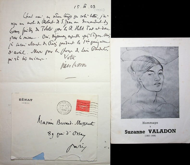 Jean Cassou (1897-1986), poète, écrivain, résistant. L.A.S.+enveloppe, 15 mars 1932, 1/2p in-4. A l'éditeur Pierre Bessand-Massenet (1899-1985). Lettre amicale, mentionnant que Robert de Saint Jean (1901-1987) lui a demandé les bonnes feuilles de son Tolstoï et le remerciant pour une « phrase de Léon Daudet qui est très curieuse » (probablement une critique de son livre). On joint une plaquette sur Suzanne Valadon avec un texte de Cassou Cachet de la collection Jean-Louis Debauve. [17]