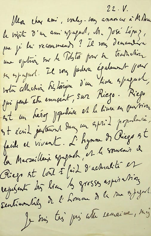 Jean Cassou (1897-1986), poète, écrivain, résistant. L.A.S., 22 mai [1932], 2p in-8. A l'éditeur Pierre Bessand-Massenet (1899-1985). Il recommande son ami, l'écrivain espagnol José Lopez (probablement José Lopez Rubio (1903-1996)) qui souhaite traduire en espagnol le Tolstoï de Cassou. Cachet de la collection Jean-Louis Debauve. [18]