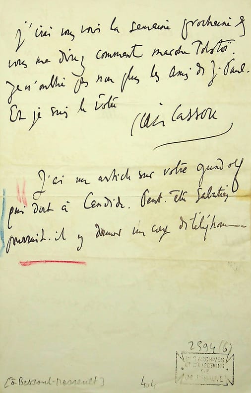 Jean Cassou (1897-1986), poète, écrivain, résistant. L.A.S.+enveloppe, 15 mars 1932, 1/2p in-4. A l'éditeur Pierre Bessand-Massenet (1899-1985). Lettre amicale, mentionnant que Robert de Saint Jean (1901-1987) lui a demandé les bonnes feuilles de son Tolstoï et le remerciant pour une « phrase de Léon Daudet qui est très curieuse » (probablement une critique de son livre). On joint une plaquette sur Suzanne Valadon avec un texte de Cassou Cachet de la collection Jean-Louis Debauve. [17]