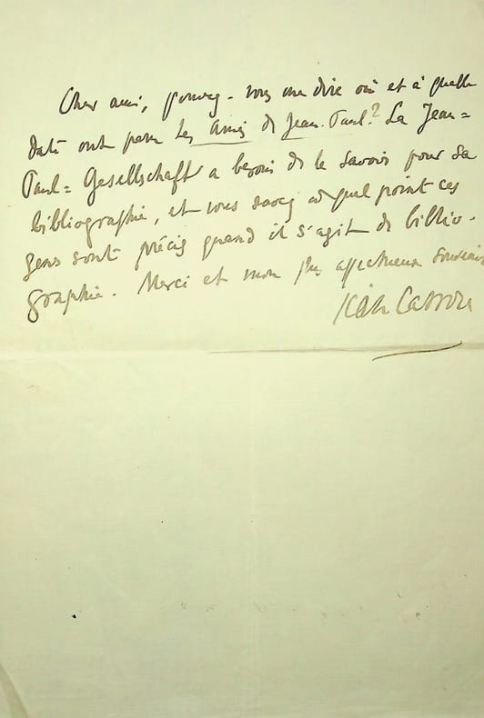 Jean Cassou (1897-1986), poète, écrivain, résistant. L.A.S., sd, 1/2p in-4. A l'éditeur Pierre Bessand-Massenet (1899-1985). Il lui demande où sont parus les amis de Jean Paul pour la bibliographie de la Jean-Paul-Gessellschaft. Johann Paul Friedrich Richter (1763-1825) dit Jean Paul était un écrivain allemand. Cachet de la collection Jean-Louis Debauve. [18]