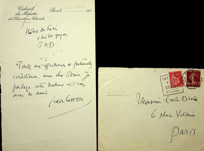 Jean Cassou (1897-1986), poète, écrivain, résistant. L.A.S. + enveloppe, Paris, 26 juillet 1937, 1p in-8. A l'acteur Emile Drain (1890-1966), connu pour ses interprétations de Napoléon. Lettre de condoléances. Cachet de la collection Jean-Louis Debauve. [18]