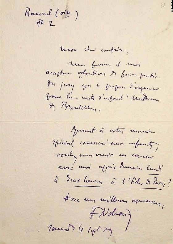 Maurice Étienne Legrand, dit Franc-Nohain (1872-1934), poète, écrivain, journaliste. L.A.S., samedi 4 septembre 1909, 1p in-12. A l'écrivain Victor Berger dit Victor Cyril (1872-1925). Lui et sa femme acceptent de faire partie d'un jury pour les mots d'enfants organisé par Caroline de Broutelles (1865-1940). Cachet de la collection Jean-Louis Debauve. [18]