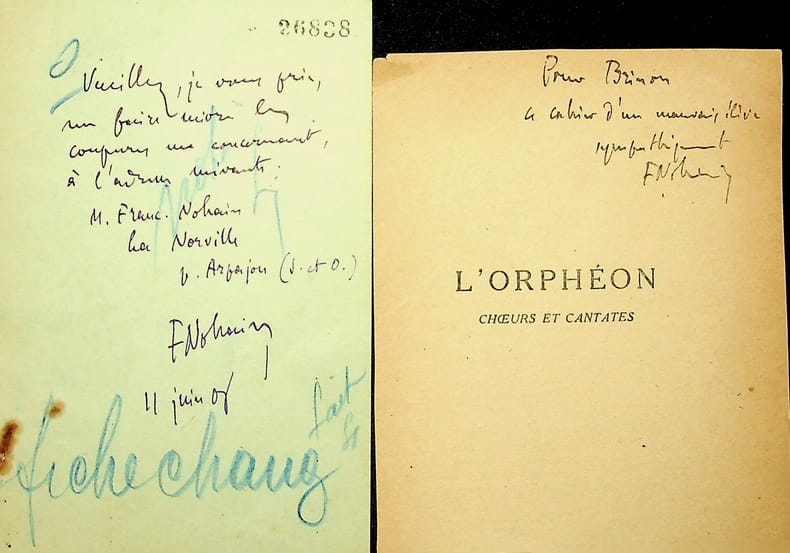 Maurice Étienne Legrand, dit Franc-Nohain (1872-1934), poète, écrivain, journaliste. L.A.S., 11 juin 1908, 1p in-12. Au courrier de la presse. Il donne sa nouvelle adresse. On joint une page de dédicace sur Orphéon (1925), à Brinon, probablement Fernand de Brinon (1885-1947). Cachet de la collection Jean-Louis Debauve. [18]