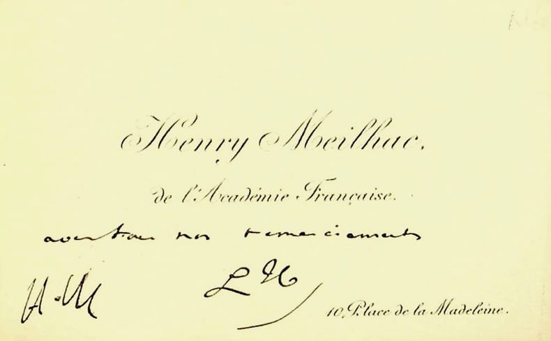 Ludovic Halévy (1834-1908), écrivain, librettiste, membre de l'Académie française ; Henri Meilhac (1830-1897), écrivain, librettiste, membre de l'Académie française. C.A.S., sd, 1 ligne. Jolie carte de visite de Meilhac, écrite par Halévy et signée des initiales par les deux : « avec tous nos remerciements LH HM ». Cachet de la collection Jean-Louis Debauve. Rare réunion. [18]