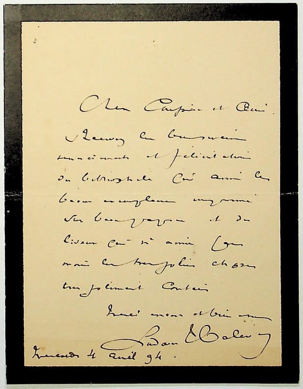 Ludovic Halévy (1834-1908), écrivain, librettiste, membre de l'Académie française. L.A.S., 4 avril 1894, 1p in-12. « Cher confrère et ami, Recevez les bons remerciements et félicitations du bibliophile qui aime les beaux exemplaires imprimé sur beau papier et du liseur qui n'aime pas moins les très jolies choses très joliment contées. Merci encore et bien à vous. Ludovic Halévy ». Cachet de la collection Jean-Louis Debauve. [18]
