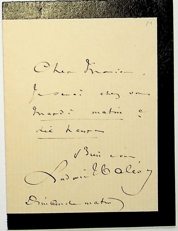 Ludovic Halévy (1834-1908), écrivain, librettiste, membre de l'Académie française. L.A.S., sd [dimanche matin], 1p in-12. Pour fixer un rendez-vous. Cachet de la collection Jean-Louis Debauve. [18]
