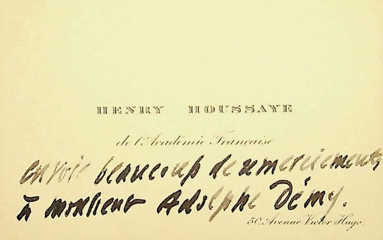 Henry Houssaye (1848-1911), historien, critique, membre de l'Académie française. C.A., sd, 2 lignes. A l'écrivain Adolphe Démy (1824-1910) : Henry Houssaye « envoie beaucoup de remerciements à monsieur Adolphe Démy ». Cachet de la collection Jean-Louis Debauve.