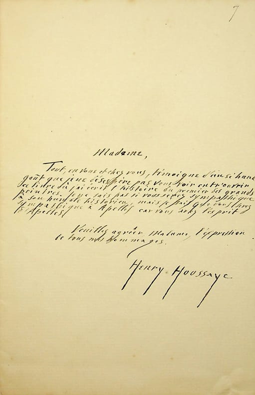 Henry Houssaye (1848-1911), historien, critique, membre de l'Académie française. L.A.S., sd [1867], 1p in-8. « Madame, Tout, en vous et chez vous, témoigne d'un si haut goût que je ne désespère pas vous voir entr'ouvrir ce livre où j'ai écrit l'histoire du premier des grands peintres. Je ne sais pas si vous serez sympathique à son humble historien, mais je sais que vous serez sympathique à Apelles car vous avez l'esprit d'Apelles. Veuillez agréer, madame, l'expression de tous mes hommages. Henry Houssaye ». Houssaye publie son premier livre, Histoire d'Apelles, en 1867. Dernier feuillet déchiré et réparé. Cachet de la collection Jean-Louis Debauve. [19]