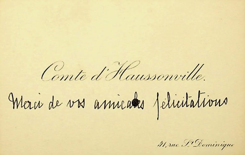 Paul-Gabriel d'Haussonville (1843-1924), écrivain, homme politique, avocat, membre de l'Académie française. C.A., sd, 1 ligne. « Merci de vos amicales félicitations ». Cachet de la collection Jean-Louis Debauve. [20]