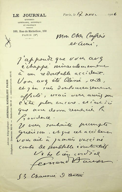 Fernand Hauser (1869-1941), poète, journaliste. L.A.S., Paris, 17 novembre 1906, 1p in-8. A l'écrivain Jules Bois (1868-1943). Il a appris que Bois avait eu un accident et lui souhaite bonne guérison. Cachet de la collection Jean-Louis Debauve. [20]