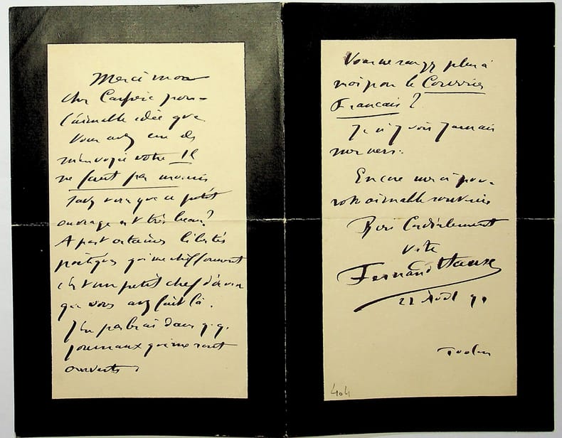 1894 Deux pages et demie sur un feuillet double (129 X 140 mm) de papier vergé bleuté, rédigées à l'encre noire.