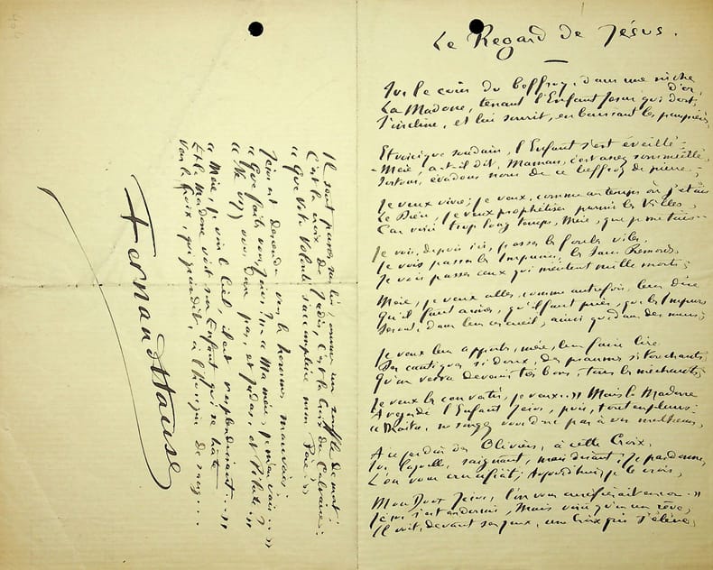 Fernand Hauser (1869-1941), poète, journaliste. Poème autographe signé, sd [1894], 36 vers. Long poème titré « Le Regard de Jésus », formé de 12 tercets. Il ne semble pas avoir été publié mais a été lu lors d'une soirée littéraire de La Plume le 1er décembre 1894. Cachet de la collection Jean-Louis Debauve. Deux petits trous de classement (une lettre partiellement coupée). Belle copie, rare. [20]