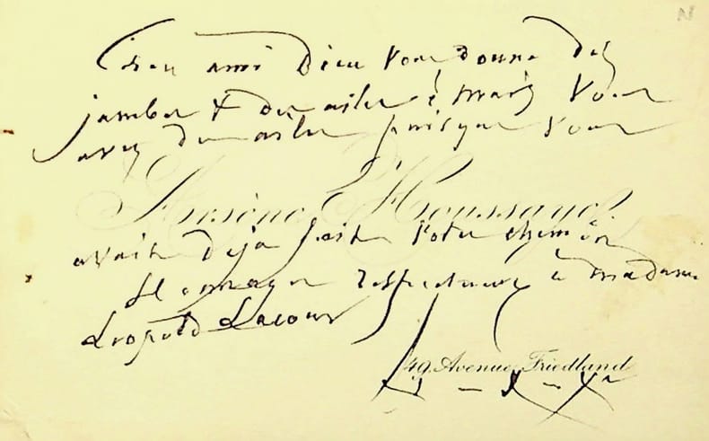 Arsène Houssaye (1814-1896), écrivain. C.A.S., sd, 6 lignes. A l'écrivain et professeur Léopold Lacour (1854-1939). « Cher ami, Dieu vous donne des jambes & des ailes [mot illisible] vous avez des ailes puisque vous avait [sic] déjà fait votre chemin. Hommages respectueux à madame Léopold Lacour. A Houssaye ». Cachet de la collection Jean-Louis Debauve. [21]