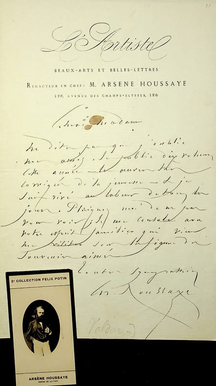 Arsène Houssaye (1814-1896), écrivain. L.A.S., sd [ca.1866], 1p in-8. A Mélanie Waldor (1796-1871). « chère madame, ne dites pas que j'oublie mes amis. Je publie dix volumes cette année. Les oeuvres très corrigées de la jeunesse. & je suis rivé au labeur de tous les jours. Plaignez-moi de ne pas vous voir ; je me console avec votre esprit familier qui vient me visiter sur la figure du souvenir aimé. Toutes mes sympathies. Ar Houssaye ». Cachet de la collection Jean-Louis Debauve. [21]