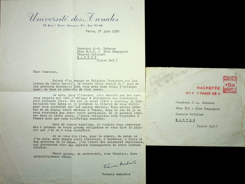 Francis Ambrière (1907-1998), écrivain, journaliste, éditeur, prix Goncourt 1940. L.S.+ enveloppe, 17 juin 1952, 1p in-4. A Jean-Louis Debauve (1926-2016), magistrat, collectionneur. Il le remercie pour l'envoi de documents concernant Marie Dorval. Ambrière travaillait sur Dorval et publiera trois livres à partir de 1987. Cachet de la collection Jean-Louis Debauve. [405]
