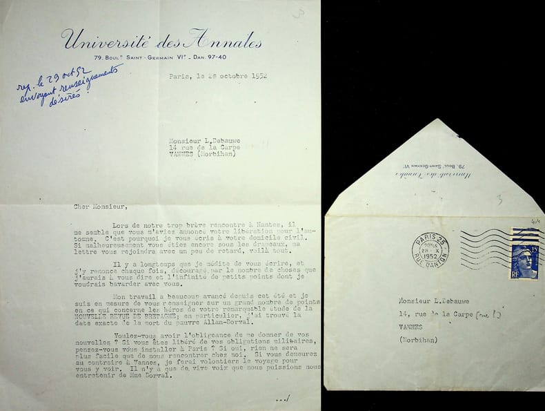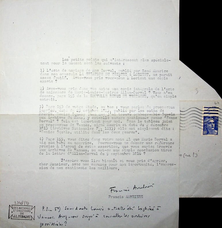Francis Ambrière (1907-1998), écrivain, journaliste, éditeur, prix Goncourt 1940. L.S. avec note autographe + enveloppe, 28 octobre 1952, 2p in-4. A Jean-Louis Debauve (1926-2016), magistrat, collectionneur. Il lui pose plusieurs questions sur Marie Dorval. Ambrière travaillait sur Dorval et publiera trois livres à partir de 1987. Cachet de la collection Jean-Louis Debauve. [405]