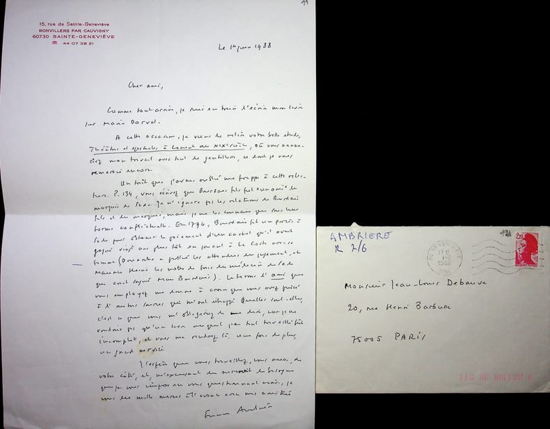 Francis Ambrière (1907-1998), écrivain, journaliste, éditeur, prix Goncourt 1940. L.A.S. + enveloppen 1er juin 1988, 1p in-4. A Jean-Louis Debauve (1926-2016), magistrat, collectionneur. Belle lettre annonçant son ouvrage sur Dorval (probablement Mademoiselle Mars et Marie Dorval), remerciant Debauve qui l'annonce déjà. Belle lettre amicale. Ambrière travaillait sur Dorval et publiera trois livres à partir de 1987. Cachet de la collection Jean-Louis Debauve. [405]