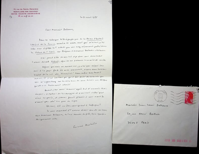 Francis Ambrière (1907-1998), écrivain, journaliste, éditeur, prix Goncourt 1940. L.A.S.+enveloppe, 21 avril 1985, 1p in-4. A Jean-Louis Debauve (1926-2016), magistrat, collectionneur. Il lui demande son article sur « Brizeux et Marceline Desbordes-Valmore » dont il a appris l'existence dans la rubrique bibliographique d'une revue. Il le tiens aussi au courant de l'avancée d'un travail et lui demande où il en est avec Jules Lafforgue. Cachet de la collection Jean-Louis Debauve. [405]