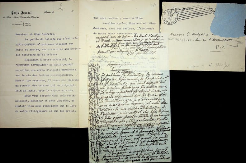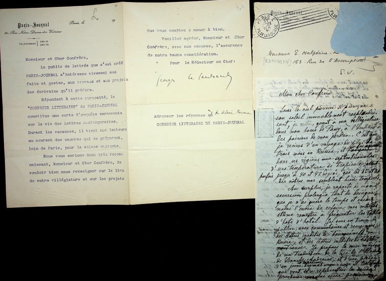 Georges Le Cardonnel (1872-1941), écrivain, critique. L.S., 31 juillet 1911, 2p in-8. A l'écrivain et traducteur Ely Halpérine-Kaminsky (1858-1936). Le public s'intéressant aux faits et gestes des écrivains, il lui demande son lieu de villégiature et ses projets. Les réponse sont à adresser à Alain-Fournier, qui était alors critique littéraire de Paris-Journal. On joint le brouillon autographe d'une réponse, certainement d'Halpérine-Kaminsky. Cachet de la collection Jean-Louis Debauve. [405]