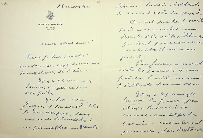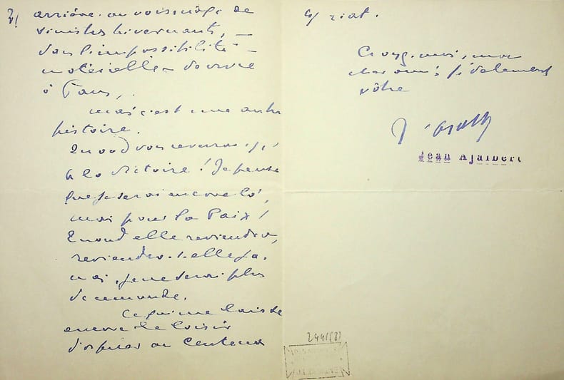 Jean Ajalbert (1863-1947), écrivain, membre de l'Académie Goncourt. L.A.S., Nice, 13 mars 1940, 3p 1/2 in-4. Longue lettre remerciant son correspondant pour son « souvenir », 25 ans après sa rencontre avec l'aviateur Roland Garros, qu'Ajalbert avait accueil au château de Malmalson lors du Noël 1914, dernier Noël de Garros en homme libre. Ajalbert était alors conservateur du château. Cachet de la collection Jean-Louis Debauve. Ecriture parfois difficile à lire. [405]