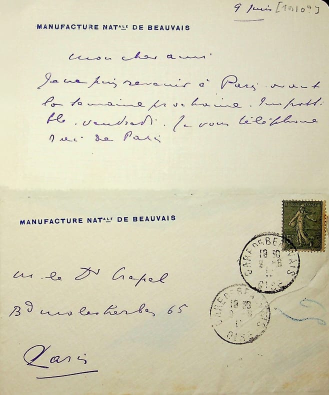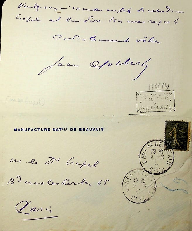 Jean Ajalbert (1863-1947), écrivain, membre de l'Académie Goncourt. L.A.S. + enveloppe, 9 juin 1910, 2p in-12 oblong. Au docteur Victor Crépel, médecin du « Tout Paris ». Il refuse probablement une invitation, étant absent de Paris. Cachet de la collection Jean-Louis Debauve. [405]