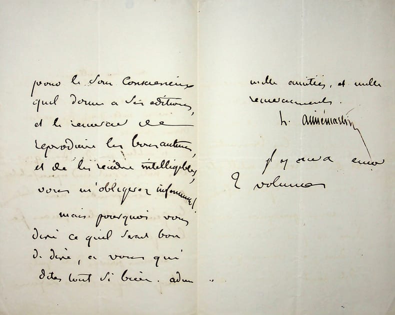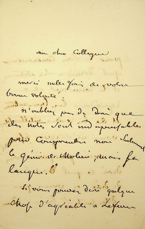 Louis-Aimé Martin (1782-1844), écrivain. L.A.S., sd [ca.1826], 2p 1/2 in-8. Belle lettre à un ami à qui il vient d'envoyer des volumes de son Molière (Paris, Lefèvre, 1824-1826), tout en signalant qu'il y en aura encore 2 (il y en eut 8 en tout). Il demande aussi de signaler l'importance des notes « pour comprendre non seulement le génie de Molière mais sa langue ». Cachet de la collection Jean-Louis Debauve. [405]