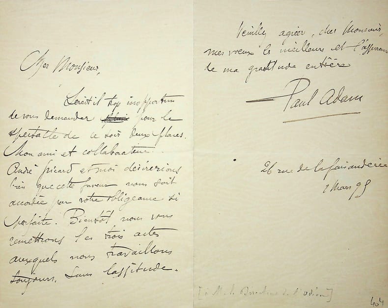 Paul Adam (1862-1920), écrivain. L.A.S., 2 mars 1895, 1p 1/2 in-8. A un directeur de théâtre, pour obtenir deux places pour le spectacle du soir. Une note indique que le destinataire est le directeur de l'Odéon mais nous ne trouvons que la trace de l'opérette de Maurice Ordonneau et Frédéric Toulmouche créée au théâtre des Folies-Dramatiques. Cachet de la collection Jean-Louis Debauve. [406]