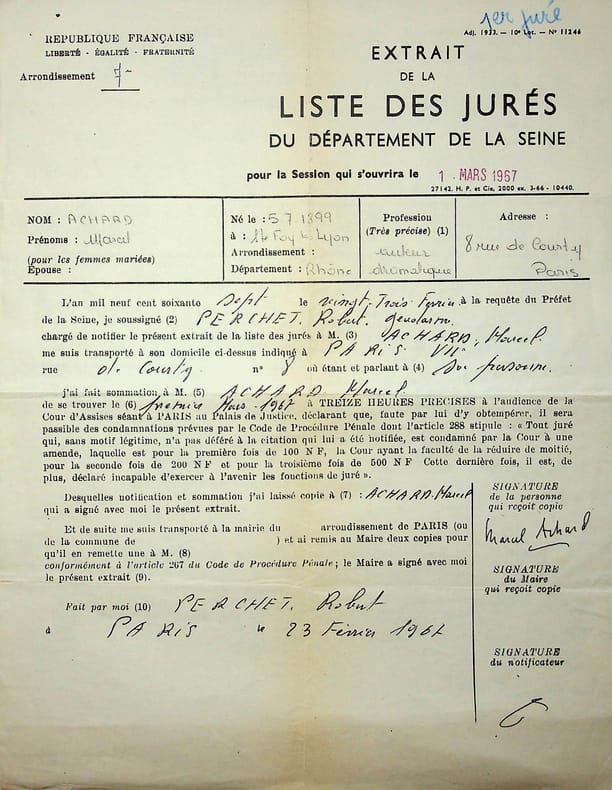 Marcel Achard (1899-1974), écrivain, réalisateur, membre de l'Académie française. P.S., 23 février 1967, 1p in-4. Copie de sa convocation comme juré d'assises, signée par Achard et le fonctionnaire qui lui a remise. Cachet de la collection Jean-Louis Debauve. [406]