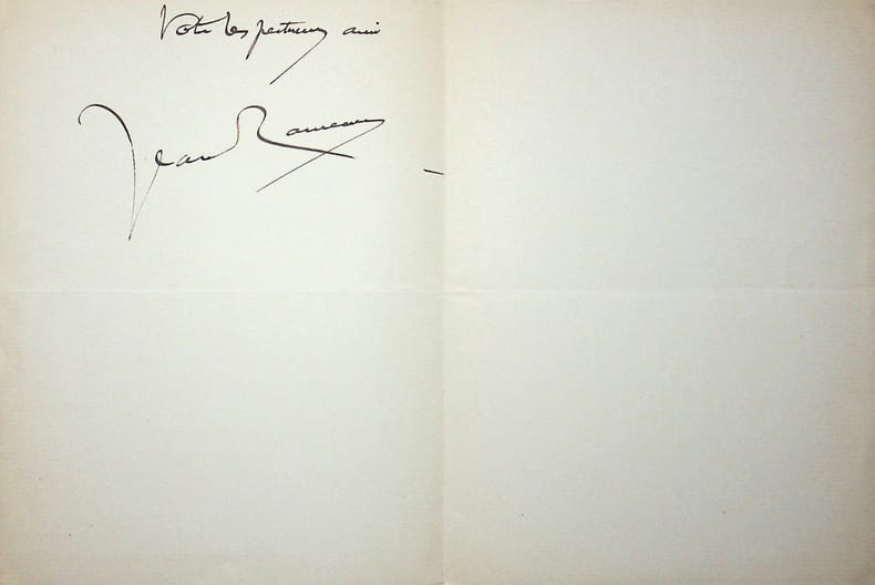 Jean Rameau (1858-1942), poète, romancier, membre des Hydropathes. L.A.S., sd, 1p 1/4 in-8. A l'écrivain Paul Hervieu (1857-1915). Ayant déjà un dîner le mercredi, il ne peut pas se rendre chez Hervieu pour une réunion. Il serait toutefois heureux de passer le voir après son dîner. [406]