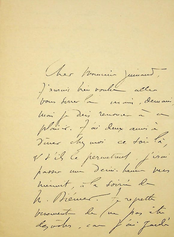Jean Rameau (1858-1942), poète, romancier, membre des Hydropathes. L.A.S., sd, 1p 1/2 in-8. Au poète Edouard Guinand (1838-1909). Il ne peut se rendre à son invitation. [406]
