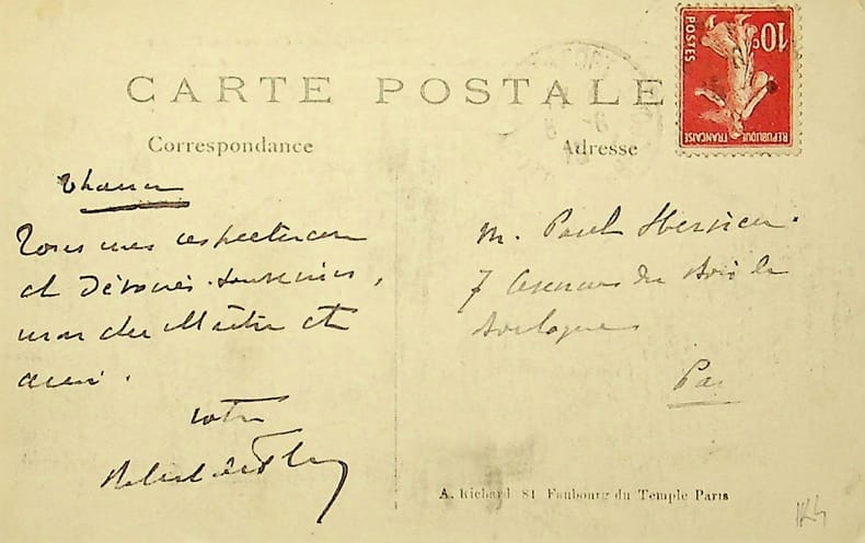 Robert de Flers (1872-1927), écrivain, membre de l'Académie française. L.A.S., 6 juin 1915, 1p in-12. A l'écrivain Paul Hervieu (1857-1915). Sur carte postale. Court courrier amical. [406]