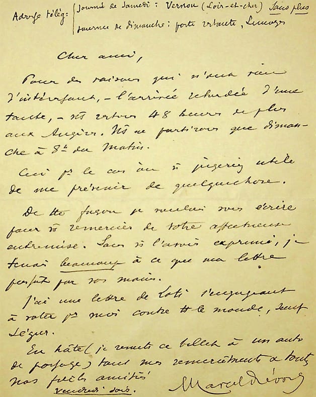 Marcel Prévost (1862-1941), écrivain, membre de l'Académie française. L.A.S., ?, 1p in-12. A l'écrivain Paul Hervieu (1857-1915) : « . De toute façon, je voulais vous écrire pour vous remercier de votre affectueuse entremise. Sans vous l'avoir exprimé, je tenais beaucoup à ce que ma lettre passât par vos mains. J'ai une lettre de Loti s'engageant à voter pour moi contre tout le monde, sauf Ségur ». Le cachet donne l'impression d'être de 1908 mais il s'agit assurément de Pierre de Ségur (1853-1916) qui sera élu le 14 février 1907. [406]